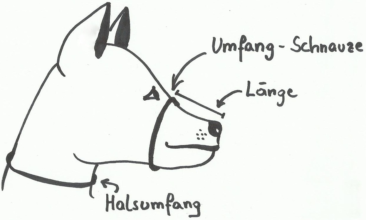 Damit der Maulkorb sicher und bequem an Ihrem Vierbeiner anliegt, ist die exakte Abnahme der benötigten Maße entscheidend!